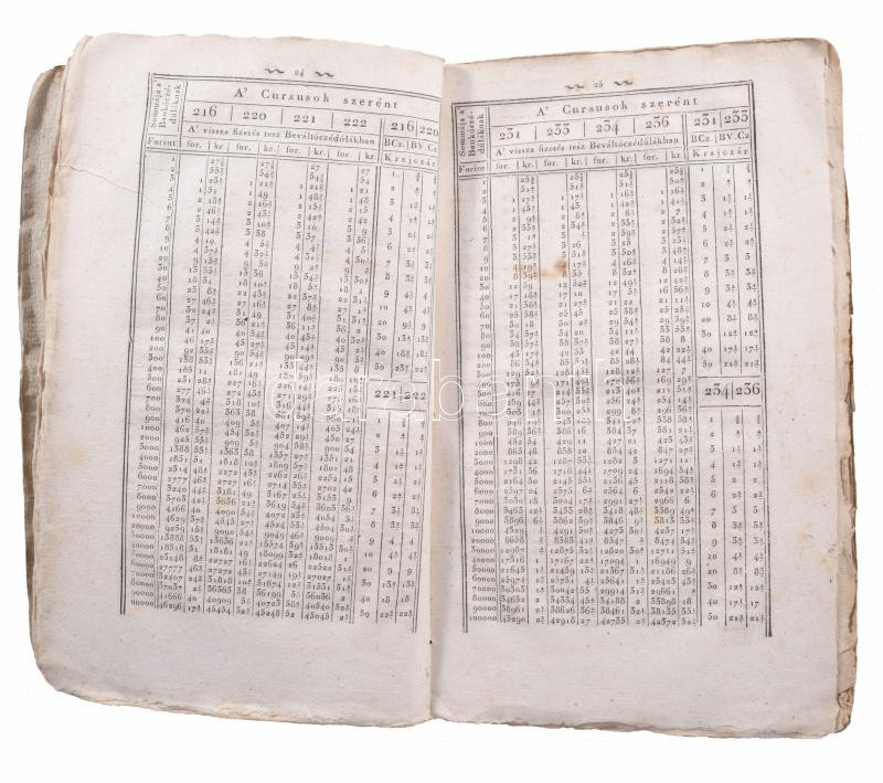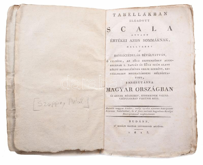 [Suppini Antal]: Tabellákban előadott scala. Avvagy értékei azon sommáknak, mellyeket a bankóczédulák béváltatván, ő felsége, az 1812 esztendőben augustusnak 1. napján és 8312 szám alatt költt rendelésének ereje szerént, kegyelmesen meghatározni méltóztatott, ennekutána Magyar országban és annak részeiben, kinekkinek váltóczédulákban fizetnie kell. Ötödik magyar kiadás, melly nyoltz ujonnan kidolgozott Intereses Tabellákkal, és a fenn említett kegyelmes Királyi Rescriptummal megbövitetett.Budánn, 1813. Kir. Magyar Universitás bet. 56 p. (a 43. oldaltól önálló címlappal: Kegyelmes királyi rendelés, melly által meghatároztatik, mikép kellyen minden fizetéseket ... váltóczédulákban megtenni.). Fűzve, korabeli borítóban.