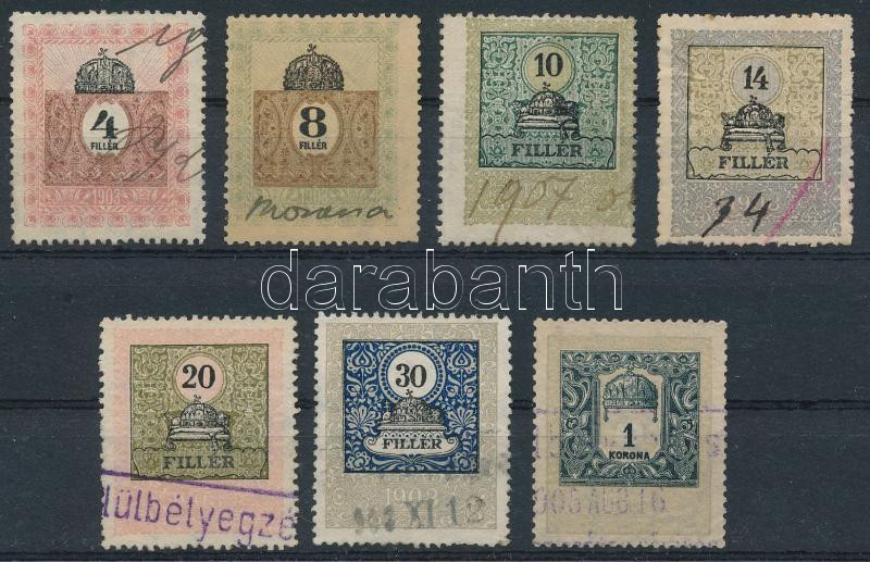 1904 7 db okmánybélyeg fordított vízjellel / inverted watermark (14f ránc / crease)