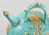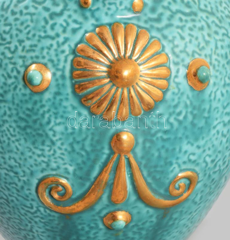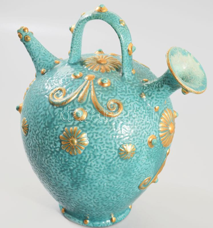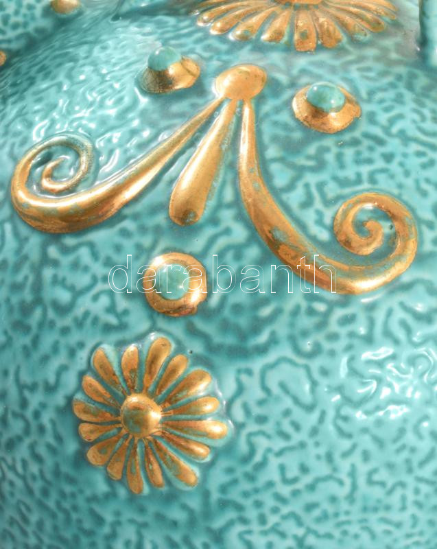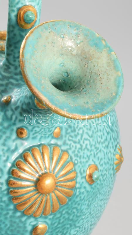 cca 1885 Zsolnay aszkosz. Korongozott és kézzel formált, plasztikus elemekkel díszített porcelánfajansz. Tigermázas türkiz alapon aranyozott plasztikus díszítmények. Alján jelzett: masszába nyomott Zsolnay Pécs és 681 formaszám. Kis aranykopással, m: 26 cm /// Circa 1885 Zsolnay askos. Wheel-thrown and hand-formed porcelain faience, decorated with plastic (relief) elements. Tiger-glazed turquoise base with gilded relief decorations.
