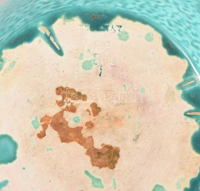 cca 1885 Zsolnay aszkosz. Korongozott és kézzel formált, plasztikus elemekkel díszített porcelánfajansz. Tigermázas türkiz alapon aranyozott plasztikus díszítmények. Alján jelzett: masszába nyomott Zsolnay Pécs és 681 formaszám. Kis