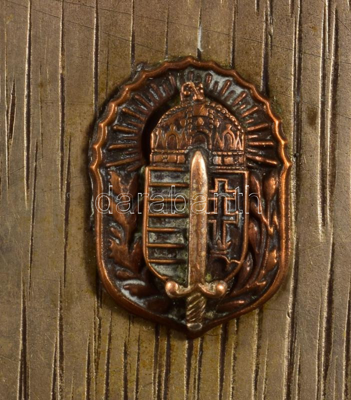 cca 1930-1940 A Vitézi Rend jelvényével díszített ezüstözött alpakka cigarettatartó doboz, jelzett: "P.V.ALPAKA", fa betéttel, 13,5x10,5x3,5 cm