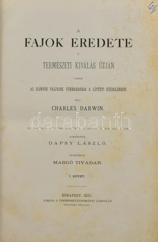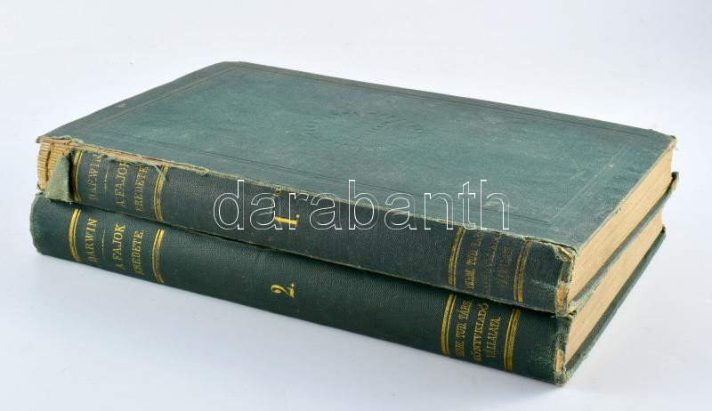 Darwin, Charles: A fajok eredete a természeti kiválás útján vagyis az előnyös válfajok fenmaradása a létérti küzdelemben. Az eredeti hatodik bővitett s javitott kiadása után fordította Dapsy László. Revideálta Margó Tivadar. I-II. kötet. Bp., 1873-1874., Kir. Magyar Természettudományi Társulat, XVI+(2)+303 p.+1 (kihajtható ábrával) t., 1 t.+VII+361+3 p. Első magyar kiadás. Kiadói aranyozott egészvászon-kötés, kopott borítóval, az I. kötet gerince sérült, az első kötetben magánkönyvtári címkével, "Bóka L. Könyvkötő Pesten" bélyegzéssel.