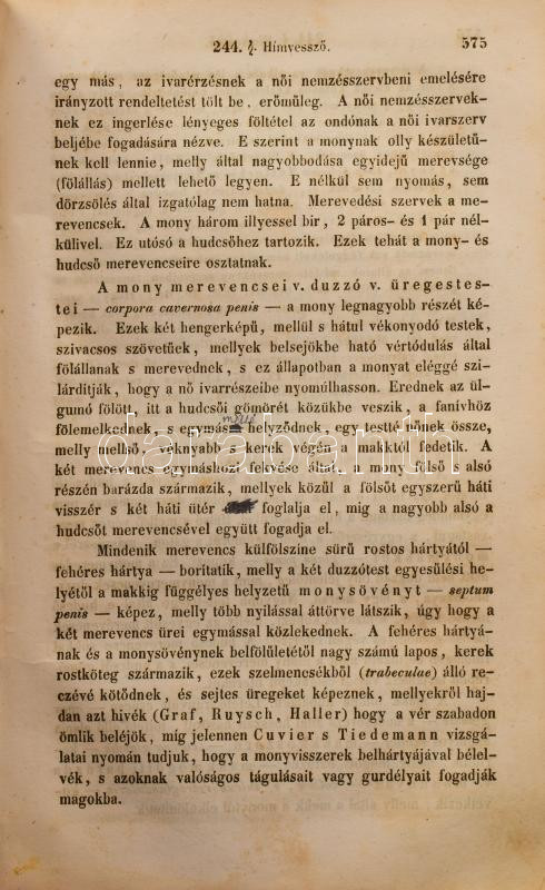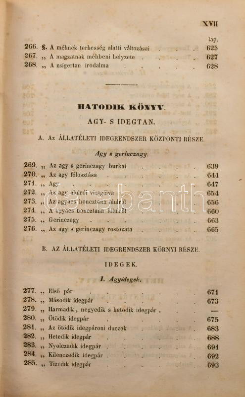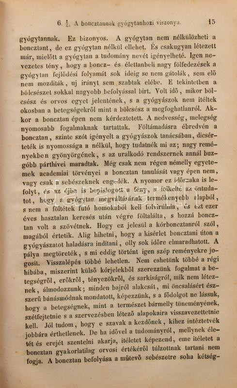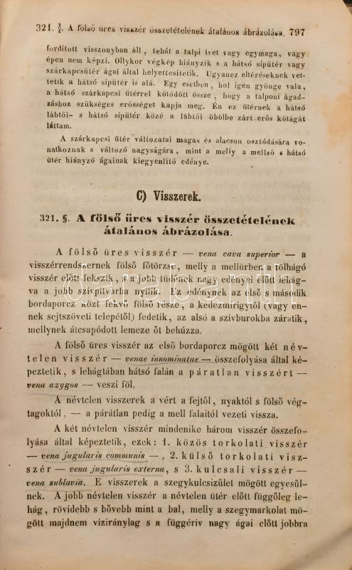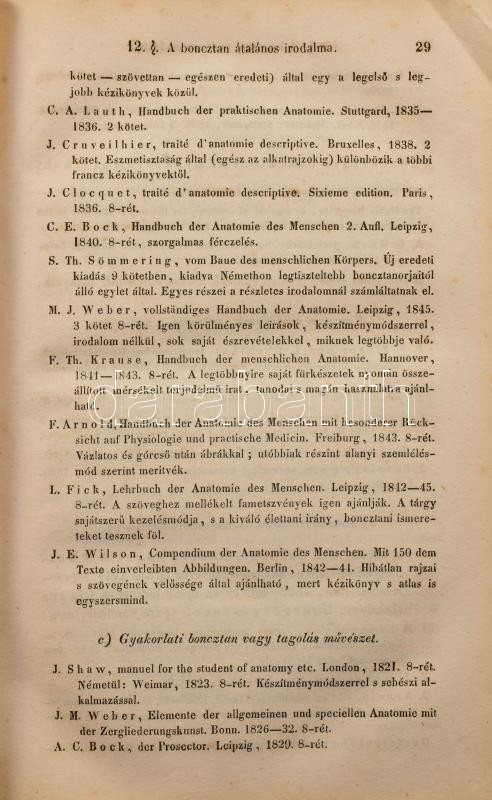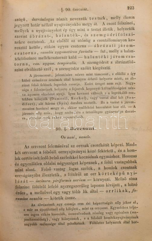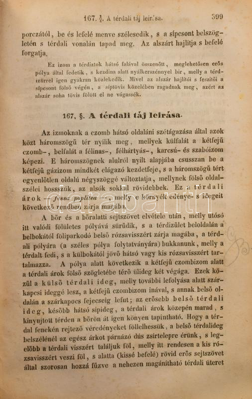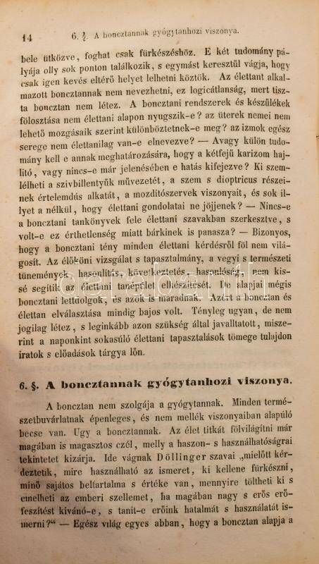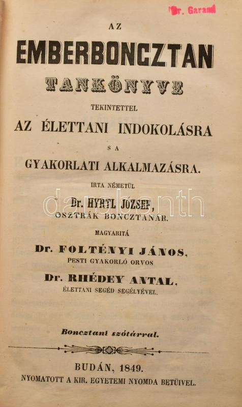 Hyrtl József: Az emberboncztan tankönyve tekintettel az élettani indokolásra s a gyakorlati alkalmazásra. Írta németül Dr. - - , magyarítá Dr. Foltényi János, pesti gyakorló orvos és Dr. Rhédey Antal, élettani segéd segéllyével. Boncztani szótárral. Buda, 1849, Kir. Egyetemi Nyomda, 2+XX+2+980+2 p. Átkötött egészvászon-kötés, kopott borítóval, a gerincen kis sérülésekkel, a gerincen hosszanti törésnyommal, ceruzás aláhúzásokkal, bejelölésekkel, és néhány bejegyzéssel, két lapon szakadással (791/792-793/794 p.), néhány lapon szamárfüllel, a 791. oldaltól a lapok sarkain kis hiánnyal, névbélyegzéssel a címlapon, valamint szecessziós magánkönyvtári címkével.