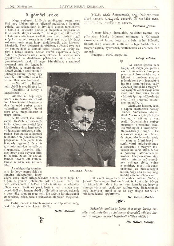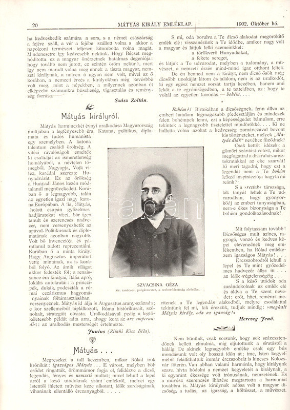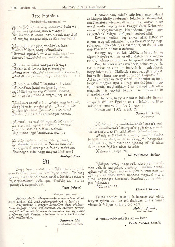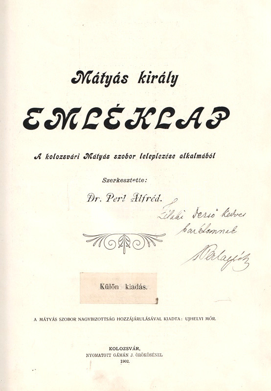 Mátyás király emléklap. A kolozsvári Mátyás szobor leleplezése alkalmából. Szerkesztette: Perl Alfréd. (Dedikált.)Kolozsvár, 1902. Ujhelyi Mór - Nyomatott Gámán J. örökösénél. 22 + [2] p. Egyetlen kiadás.Dedikált: "Zilahi