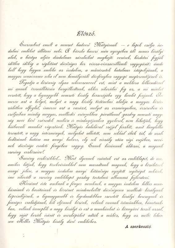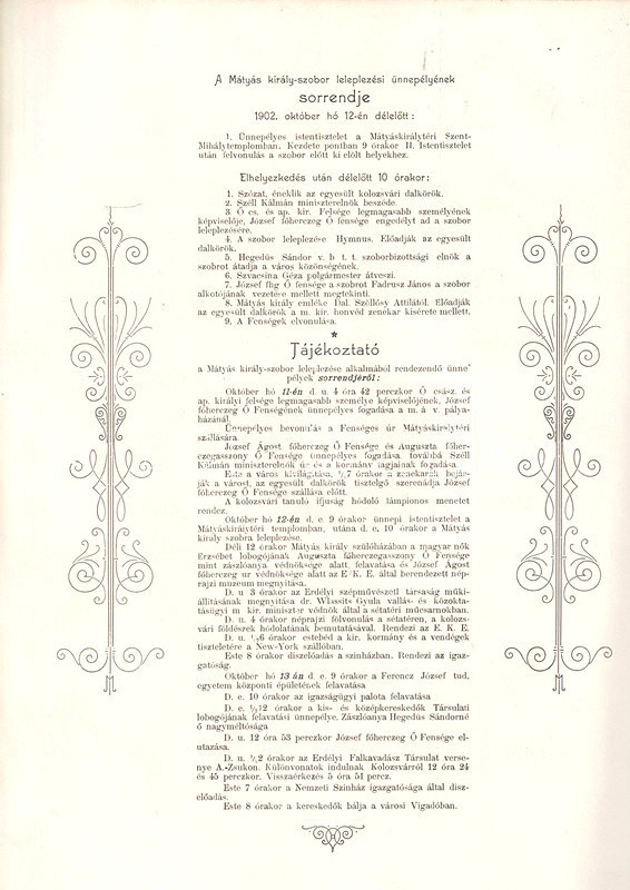 Képes albumunk a Fadrusz János szobrászművész alkotta Mátyás-szobor 1902. október 12-i leleplezési ünnepsége alkalmából készült. Ismerteti az ünnepségek menetrendjét, méltatja Mátyás uralkodásának nemzeti jelentőségét, valamint idéz az ez alkalomra készült beszédekből, politikai üzenetekből és versekből. Oldalszámozáson belül I. Ferenc József, József főherceg és Auguszta főhercegnő hártyapapírral védett egész oldalas portréja.