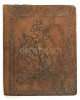 Régi, gazdagon díszített domborműves bőr mappa, kissé sérült, foltos állapotban, 27,5x22 cm