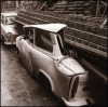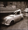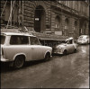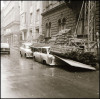 1981 Budapest, Szófia utca, egy összetört Trabant, amelyre vélhetően rádőlt a ház tatarozásához felállított állványzat, 12 db vintage NEGATÍV, 6x6 cm