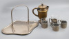 Antik fém teázó készlet, ezüstözött, hőálló üvegbetétes fém szerelékes pohárral, egyik pohár pótolt, tálcán jelzéssel. Tálca 39x30x27 cm, kanna m: 23 cm, poharak m: 9-10,5 cm