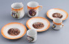 cca 1910/30 Zsolnay 7 darab porcelán tárgy: zsánerképes tálak, japonizáló hasas bögre, emlékbögre, stb. Sérülésekkel, jelzett.