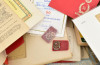 Nagy doboznyi vegyes papírrégiség, oklevelek, kitüntetések, MÁV menetrend